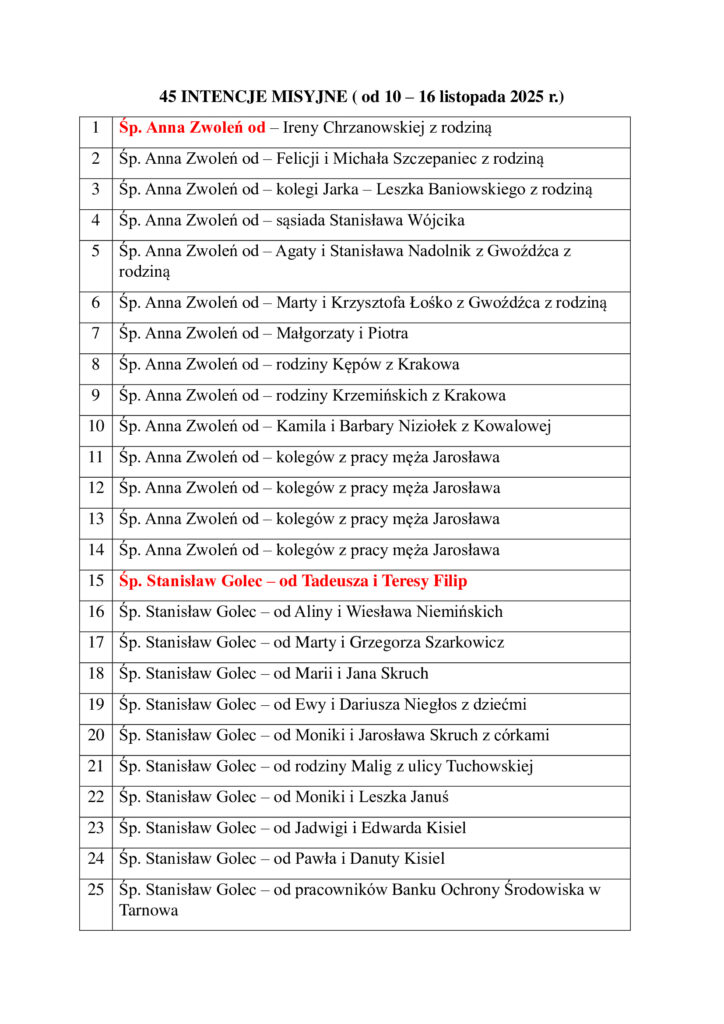 Intencje Misyjne odprawiane poza parafią (10-16.11.2025 r.)