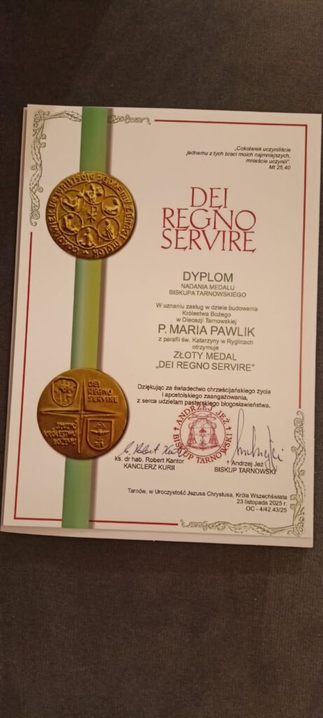 W Uroczystość Jezusa Chrystusa, Króla Wszechświata, o godzinie 10.30 była sprawowana Eucharystia w Katedrze Tarnowskiej pod przewodnictwem J.E. Ks. Bpa Andrzeja Jeża. Podczas niej nasza parafianka: Pani Maria Pawlik, otrzymała odznaczenie diecezjalne (medal) „Dei Regno Servire”, tzn. – Służyć Królestwu Bożemu. Gratulujemy Pani Marii i dziękujemy za wszelkie okazane dobro względem naszej wspólnoty. Bóg zapłać!