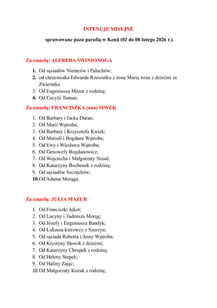 Intencje misyjne odprawiane poza parafią 02-08.02.2026 r.