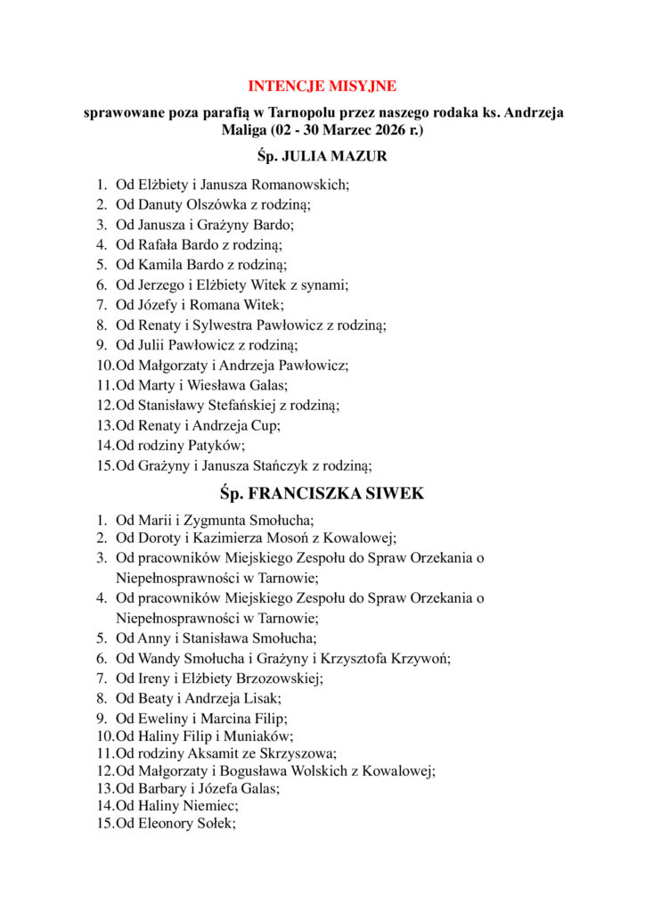 Intencje misyjne Sprawowane poza parafią w Tarnopolu przez naszego rodaka ks. Andrzeja Maliga (02 – 30 Marzec 2026 r.)